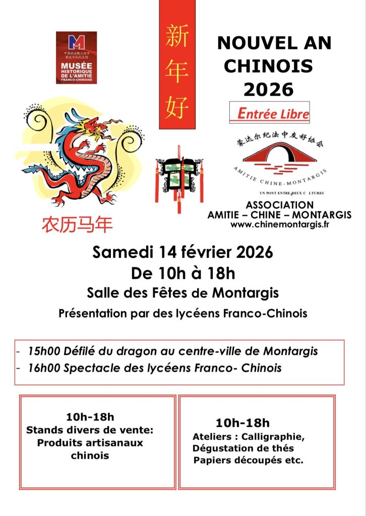 Comme chaque année, le traditionnel défilé du dragon animera le centre-ville de 15 h à 16h tandis qu’un riche programme d’animations se déroulera tout au long de la journée à la salle des Fêtes. Au rendez-vous: activités culturelles, stands de présentations (thé, riz nouveau, produits artisanaux chinois etc), spectacles ainsi que des temps d’ échanges conviviaux.